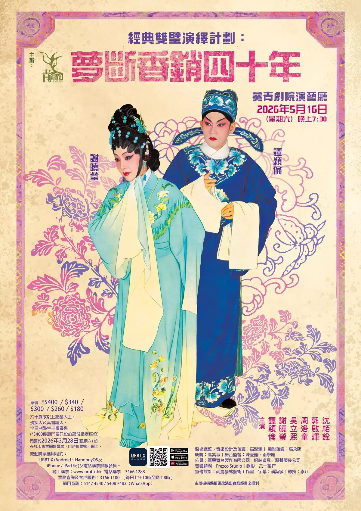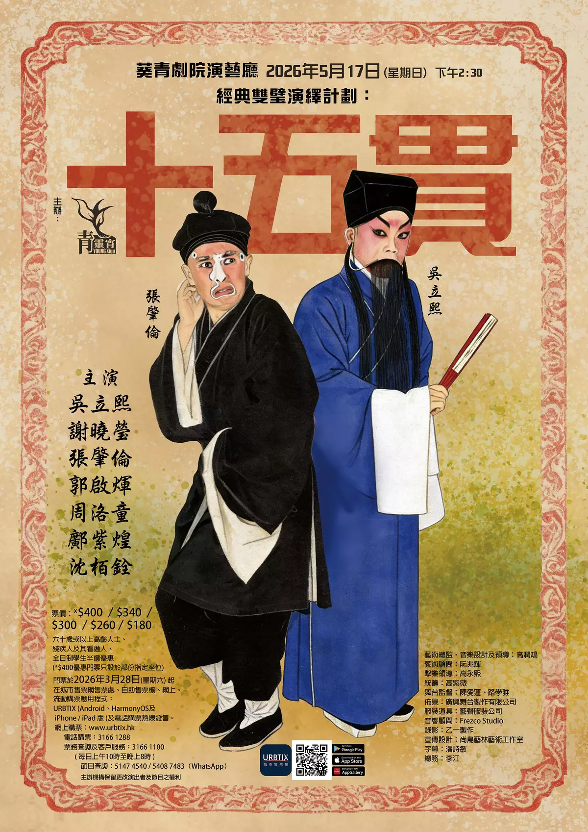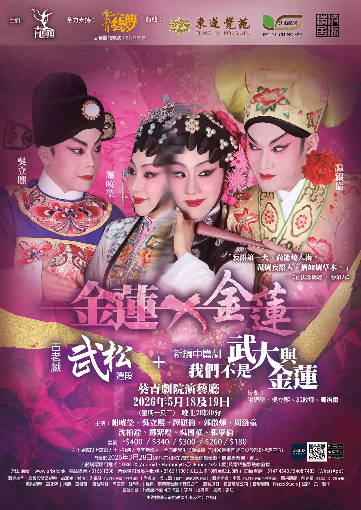 青靈宵將於5月16日至19日在葵青劇院演藝廳呈獻一連四日演出,由南鳳及阮兆輝分別擔任藝術指導及藝術顧問,為演出注入品質保證。首兩日上演「經典雙璧演繹計劃」,包括《夢斷香銷四十年》及《十五貫》,由譚穎倫、謝曉瑩、吳立熙等青年演員擔綱,傳承經典。壓軸焦點《我們不是武大與金蓮》以古喻今,緊扣當代網絡輿論與標籤文化,年輕創作團隊破格演繹,門票現於城市售票網公開發售。