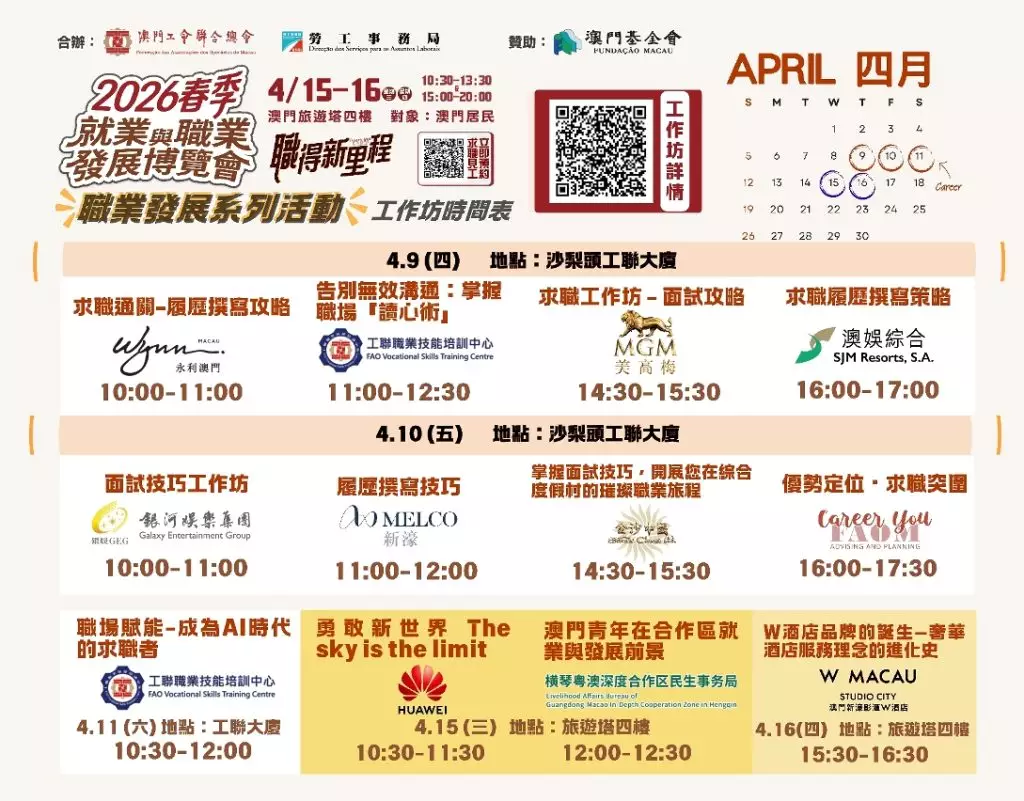 博覽會於4月15日及16日(星期三及星期四)假澳門旅遊塔會展娛樂中心四樓舉行,每日設兩個開放時段:上午10時30分至下午1時30分、下午3時至晚上8時。有意參加的本澳居民,可由明(31)日起至4月13日期間,登入勞工局網站活動專頁: https://www.dsal.gov.mo/zh_tw/standard/spring_jobfair2026.html報名,名額有限,請有意者儘早預約。參加職業發展系列活動的人士,請留意各場次的報名截止日期及舉行日期,並按時出席。