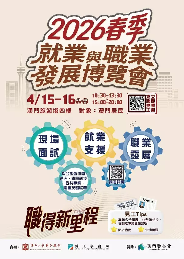 為進一步促進本澳就業市場配對,協助居民拓展職涯發展,勞工事務局(下稱「勞工局」)與澳門工會聯合總會(下稱「工聯」)將於4月15日至16日一連兩日假澳門旅遊塔會展娛樂中心四樓合辦「2026春季就業與職業發展博覽會」(下稱「博覽會」)。有意參加的澳門居民,可由明(31)日起至4月13日期間進行網上預約。