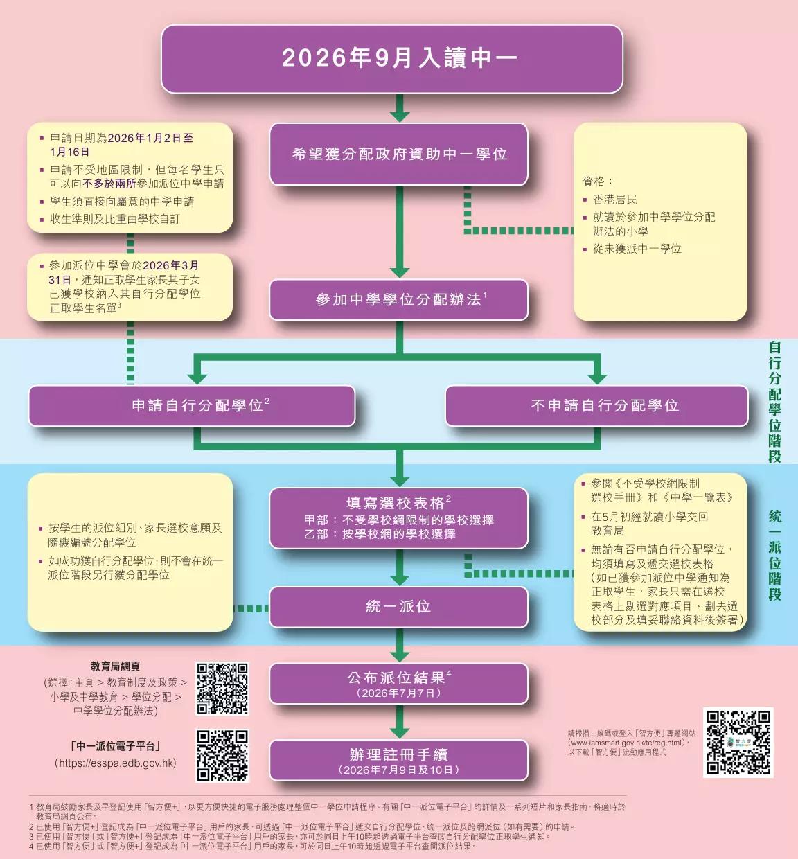 在自行分配學位正取學生的通知安排下,如學生獲參加派位中學納入其自行分配學位正取學生名單,家長將於明日收到有關中學通知。如果家長已使用「智方便」或「智方便+」登記成為「中一派位電子平台」用戶,亦可於明日上午10時起,透過電子平台查閱自行分配學位正取學生通知。家長毋須回覆中學是否接受有關自行分配學位。