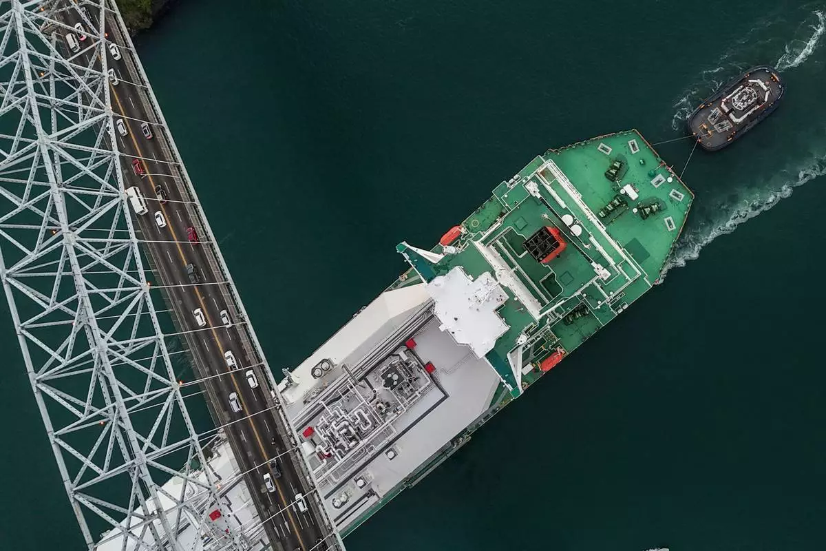 2026年3月24日周二,巴拿馬城,一艘液化天然氣運輸船駛過巴拿馬運河上的美洲大橋。(美聯社圖片/Matias Delacroix) AP圖片
