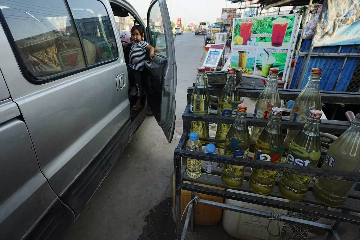2026年3月30日周一,柬埔寨金邊一間小販店舖展示汽油瓶。(美聯社圖片/Heng Sinith) AP圖片