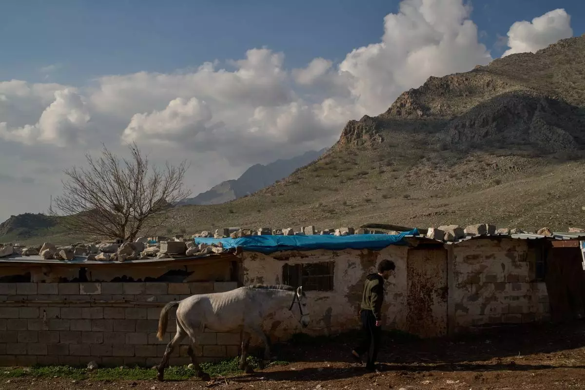 2026年3月17日,周二,22歲的伊拉克-伊朗跨境走私者阿科·阿卜杜勒·拉赫曼(Ako Abdul Rahman),在伊拉克哈拉卜賈附近山區的一個村莊大院內牽着一匹馬。(美聯社圖片/利奧·科雷亞) AP圖片