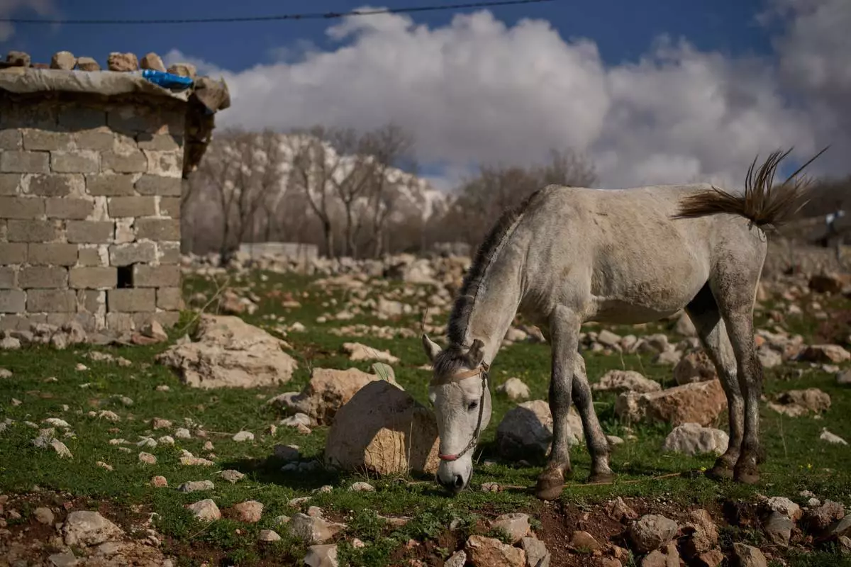 2026年3月17日,周二,在伊拉克哈拉卜賈附近山區的一個村莊大院內,一匹用於伊拉克-伊朗跨境走私的馬匹。(美聯社圖片/利奧·科雷亞) AP圖片