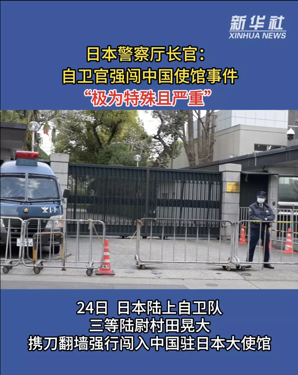 日本陸上自衛隊三等陸尉村田晃大,上星期二強行闖入中國駐日本大使館,被東京警視廳以涉嫌闖入建築物拘捕。當局在大使館發現疑似由村田帶來的刀具。