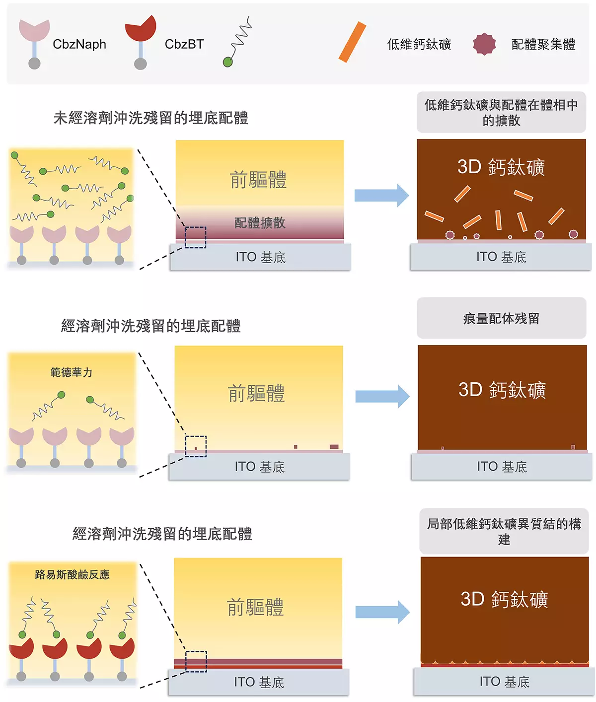 傳統的策略往往導致配體分子 受控地擴散至鈣鈦礦材料內部,或在溶劑清洗過程中大量流失,無法形成有效的配體層。本研究團隊提出全新策略,成功將配體分子固定在自組裝單分子層材料(SAM分子)上,並構建局部的「2D/3D」結構。