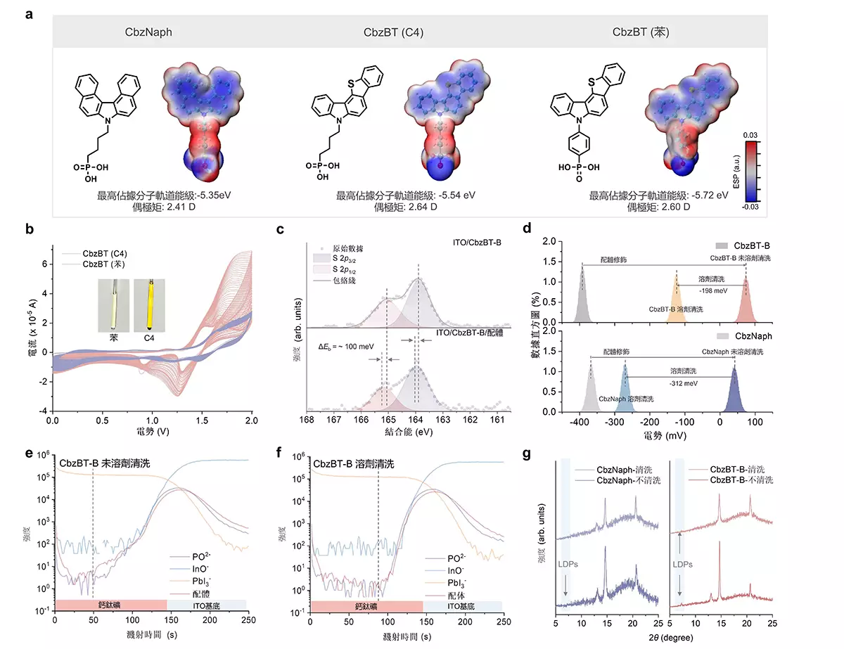 此圖為團隊設計的名為CbzBT-B的新型自組裝單分子層材料,該分子具備優異的穩定性,且其能階與鈣鈦礦更為匹配。該分子中的硫原子可與配體相互作用,確保在底界面形成局部的「2D/3D 鈣鈦礦異質結結構。