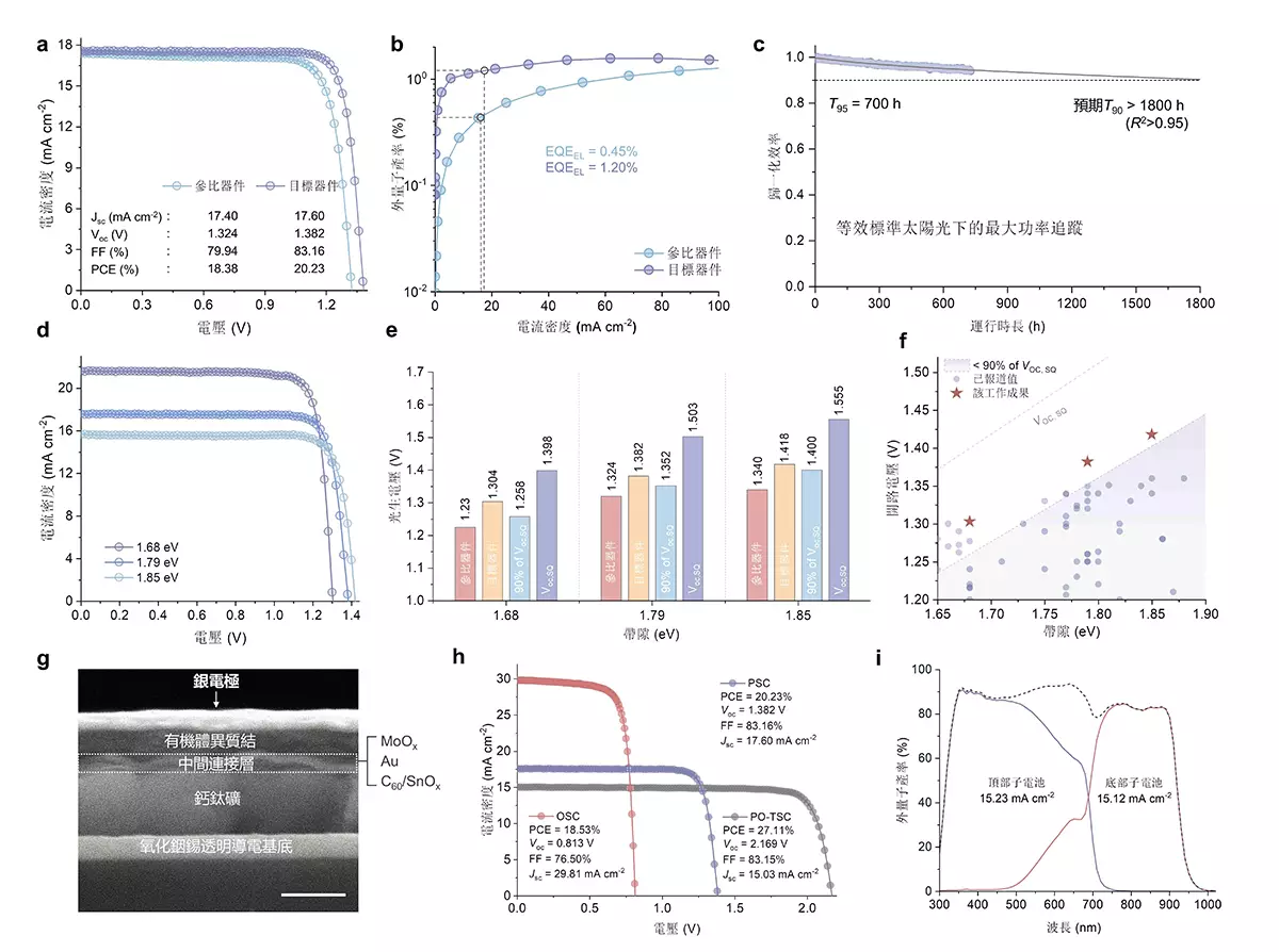 研發團隊成功研發出高效穩定的寬能帶鈣鈦礦太陽能電池,並創造了多項電池性能記錄。該類型電池在長時間運行測試中表現優異,即使連續運行700小時,效率仍保持超過九成五。根據研究團隊推算,該電池在長期使用1800小時以後,效率仍可保持在九成以上。同時,基於該技術研發的鈣鈦礦-有機疊層太陽能電池的發電效率達到百分之27.11,處於該類別疊層太陽能電池的最高效率之一。