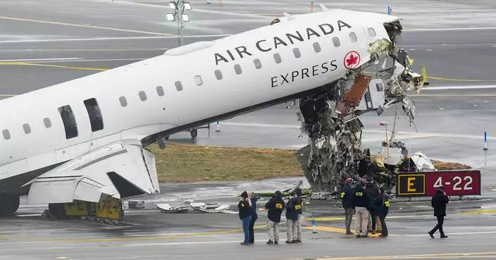 檔案圖片— 2026年3月23日周一,官員在紐約拉瓜迪亞機場(LaGuardia Airport)調查現場。一架加拿大航空(Air Canada)客機在周日晚降落後不久,與一輛港務局消防車相撞後停下。(美聯社圖片/Seth Wenig) AP圖片