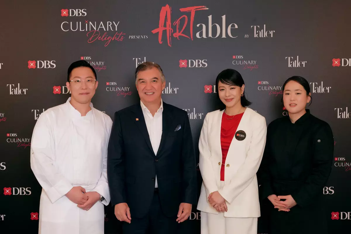 星展香港宣布「星展饗樂隨行之ARTable 2026」今日正式揭幕。(左起)「SOIGNÉ」主廚李駿、星展北亞區主管及星展香港行政總裁龐華毅、知名演員林嘉欣、尹酒黨」主理人尹娜羅。