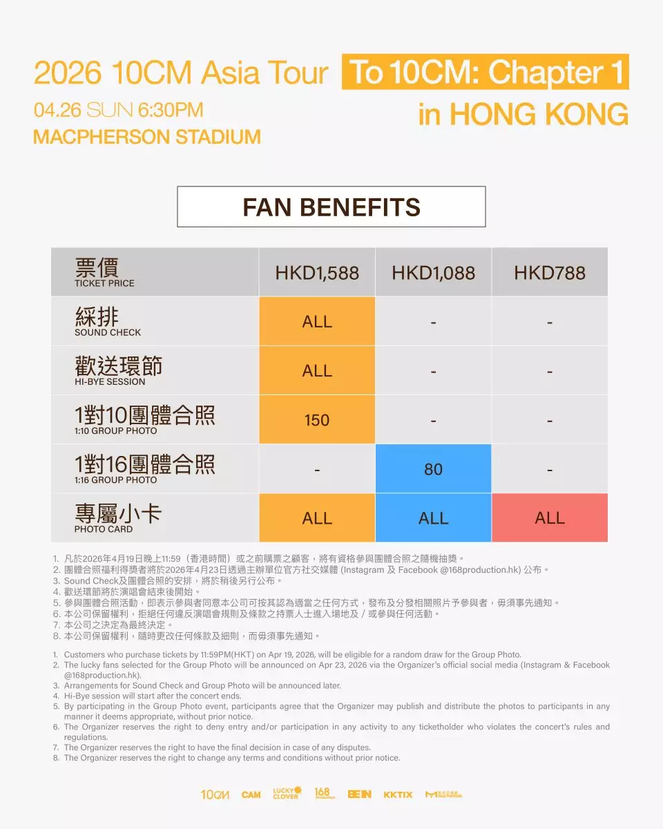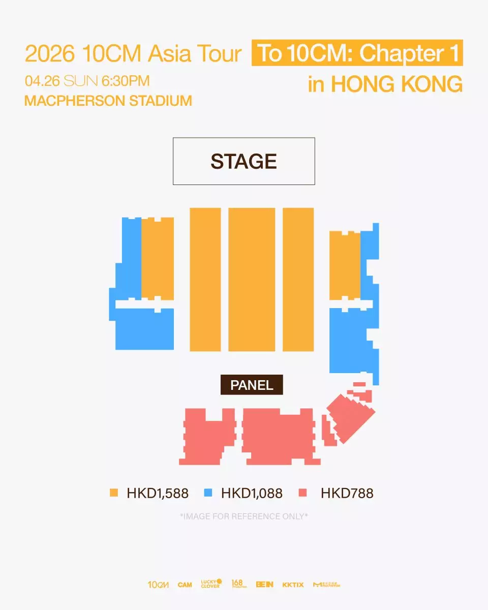 如果想在現場細聽10CM的精彩演出,以及迎接他特別準備的觀看綵排、歡送、合照、專屬小卡等多種福利,就不要錯過《2026 10CM Asia Tour <To 10CM: Chapter 1> in Hong Kong》演唱會。票價分為$1,588、$1,088和$788,現正於KKTIX熱烈發售!