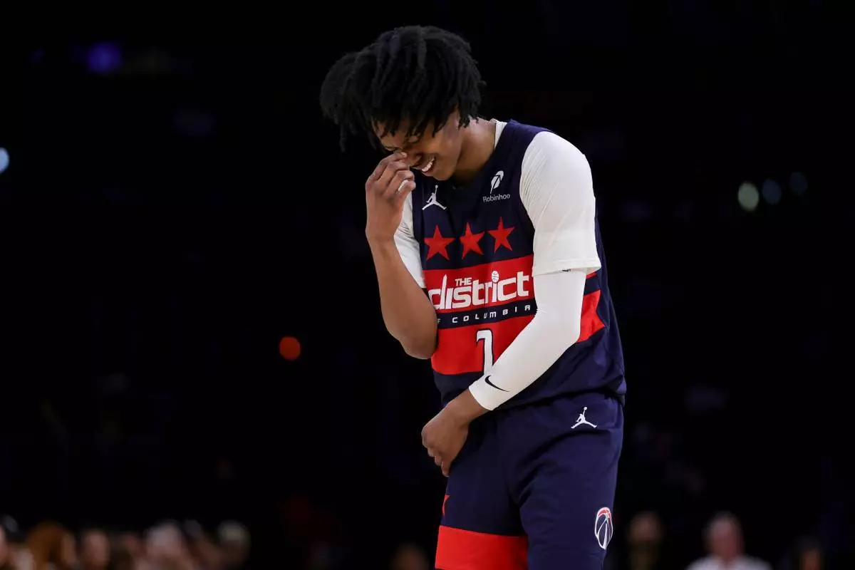 周一(2026年3月30日),華盛頓巫師後衛卡靈頓(Bub Carrington)在洛杉磯一場NBA籃球賽上半場對陣洛杉磯湖人時作出反應。(美聯社圖片/Ryan Sun) AP圖片