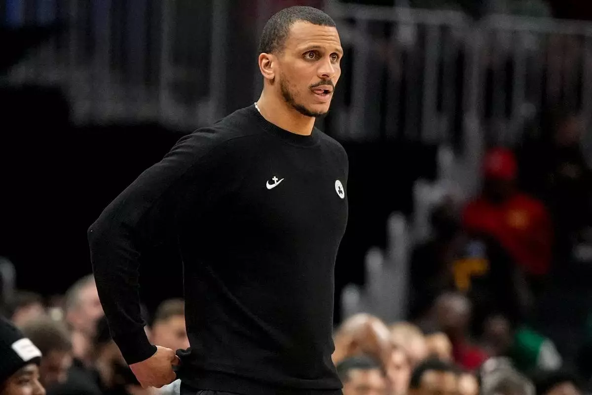 波士頓塞爾特人(Boston Celtics)主教練祖爾馬素拿(Joe Mazzulla)在2026年3月30日(周一)於阿特蘭大(Atlanta)舉行的NBA籃球賽上半場(first half)對陣阿特蘭大鷹隊(Atlanta Hawks)時觀看比賽。(美聯社圖片/Mike Stewart) AP圖片