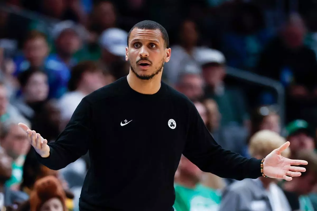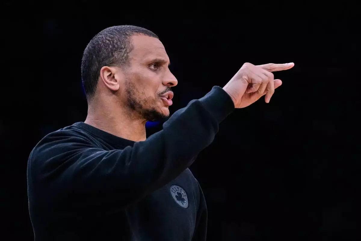 波士頓塞爾特人(Boston Celtics)主教練祖爾馬素拿(Joe Mazzulla)在2026年3月29日(周日)於北卡羅來納州夏洛特(Charlotte, N.C.)舉行的NBA籃球賽下半場(second half)對陣夏洛特黃蜂隊(Charlotte Hornets)時作出反應。(美聯社圖片/Nell Redmond) AP圖片