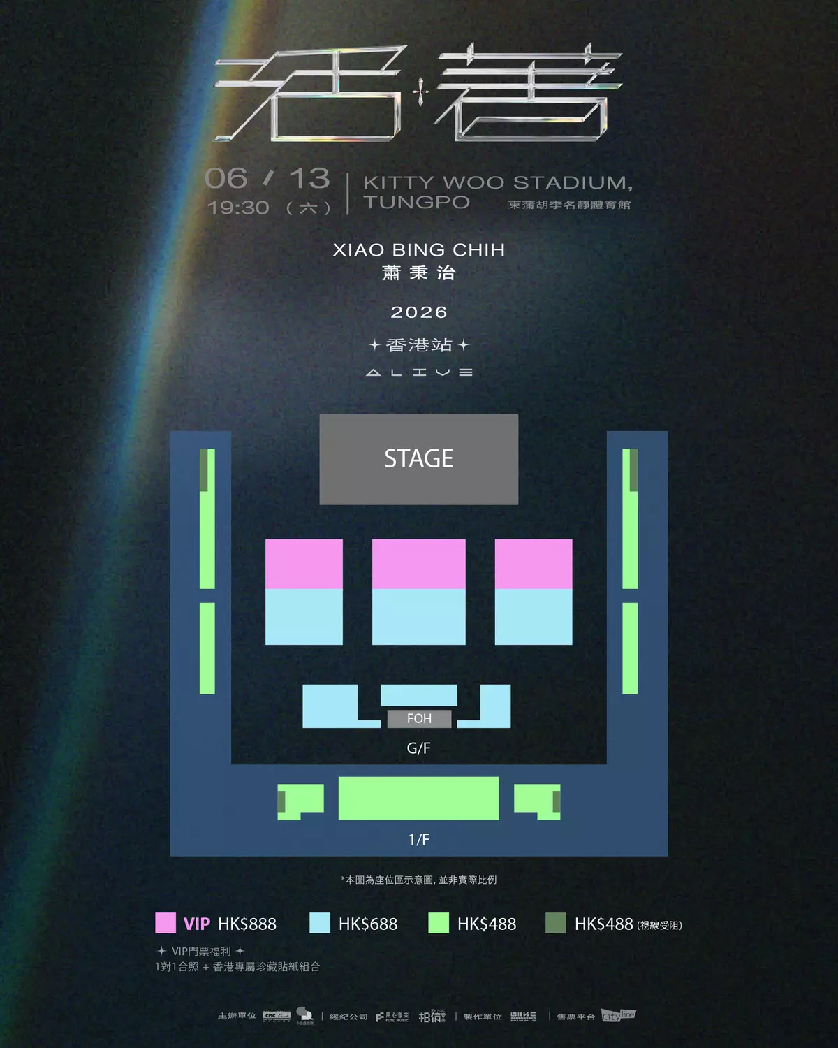 《破億神曲製造機》蕭秉治宣布將於6月13日晚上7時30分,假新蒲崗東蒲胡李名靜體育館舉行《活著 ALIVE》香港站演唱會,票價分為$888、$688及$488,門票今日(3月31日)下午3時起於Cityline公開發售。原訂去年10月舉行的演出因故延期,蕭秉治感謝歌迷久等:「遲到的約定,雙倍的感動!」