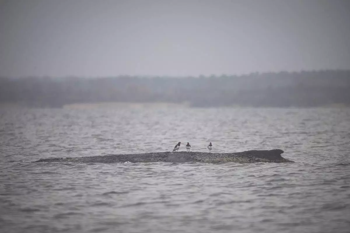 三隻水鳥棲息在德國維斯馬灣(Wismar Bay)一條座頭鯨身上。攝於2026年3月29日周日。(美聯社圖片/Philip Dulian) AP圖片