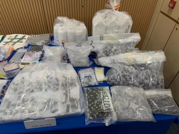 被捕男子31歲,報稱無業,有黑社會背景。他涉嫌「販運危險藥物」及「製造危險藥物」罪名被捕,現正被扣留調查,將被暫控相關罪名,案件將於星期三(4月1日)上午在屯門裁判法院提堂。