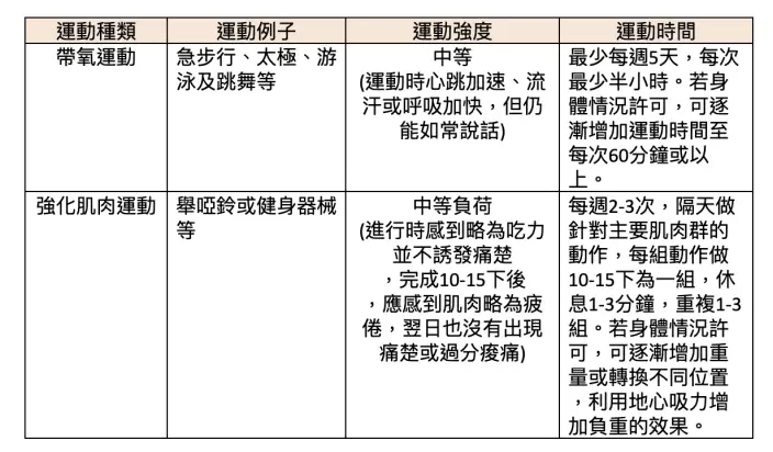 帶氧運動能有效消耗熱量,減少脂肪積聚,而強化肌肉運動能使肌肉細胞增大,增加新陳代謝,幫助身體消耗更多熱量。這兩類運動的做法,可以参考下表: