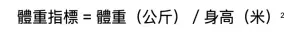 過重及肥胖的定義可參考體重指標 (BMI)。體重指標的計算方法是: