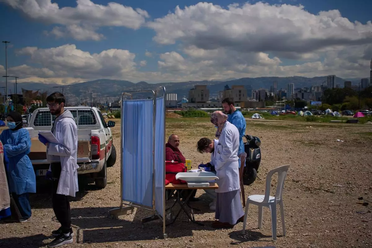 2026年3月31日周二,黎巴嫩貝魯特,一名流離失所者在以色列空襲後逃難者帳篷附近的臨時流動診所接受治療。(美聯社圖片/Emilio Morenatti) AP圖片