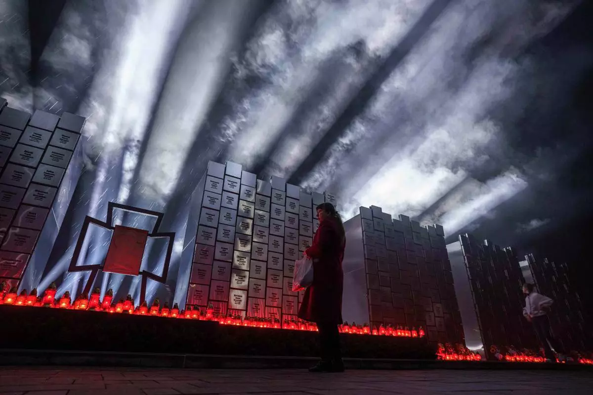 2026年3月30日周一,烏克蘭布查(Bucha, Ukraine),一名女子出席為遇難平民舉行的紀念儀式,以紀念布查解放四周年。(美聯社圖片/Evgeniy Maloletka) AP圖片