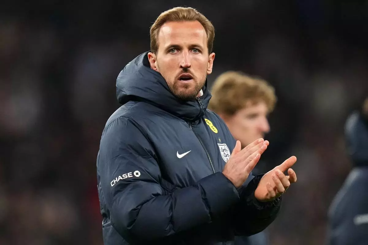 英格蘭球員哈利卡尼在倫敦的國際足球友誼賽中,球隊不敵日本後作出反應,攝於2026年3月31日周二。(美聯社圖片/Kirsty Wigglesworth) AP圖片