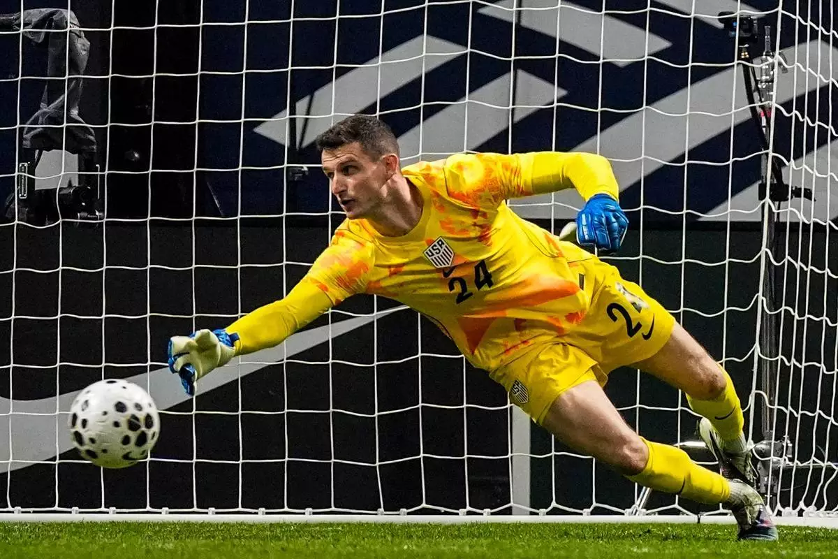 美國隊門將馬特費利斯(24號)在2026年3月31日周二於阿特蘭大舉行的國際足球友誼賽上半場,對陣葡萄牙隊時作出撲救。(美聯社圖片/Mike Stewart) AP圖片