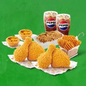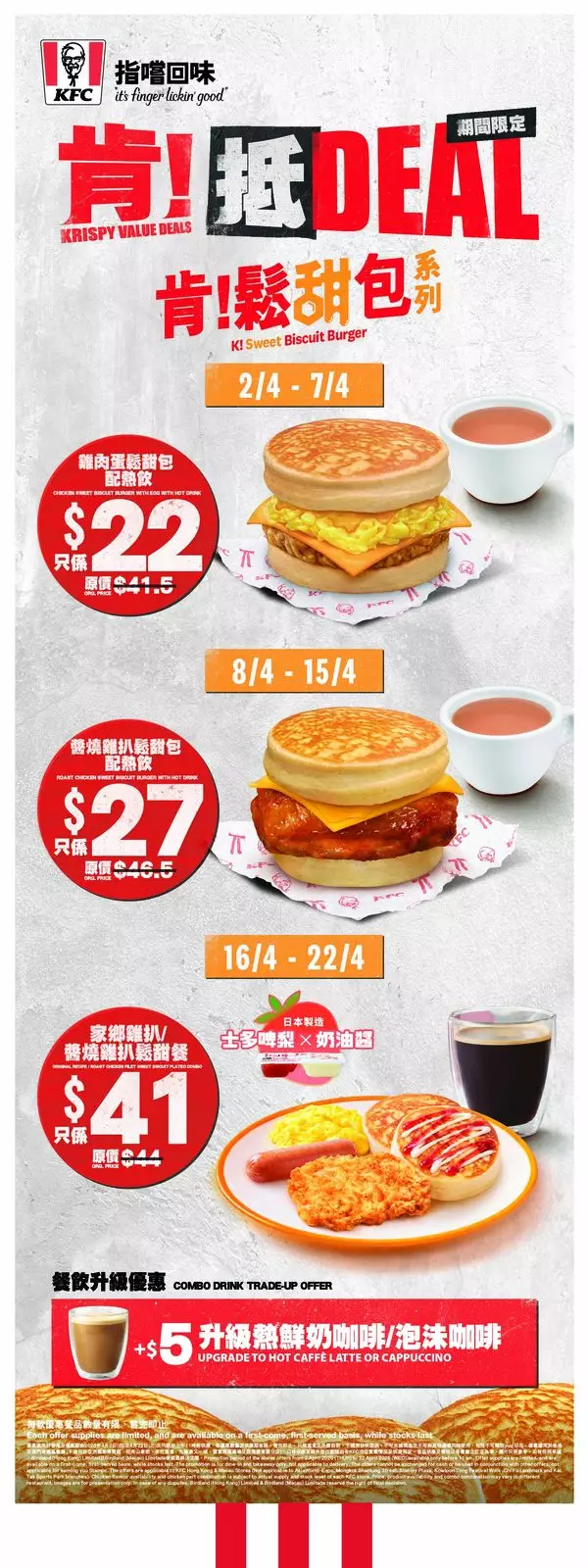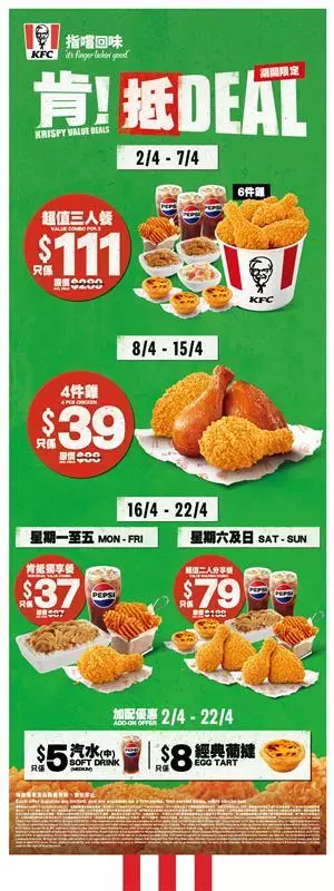 * 第一週(4月2日至7日):上午11時前為「$22 雞肉蛋鬆甜包配熱飲」;上午11時後則有聚餐首選「$111 超值三人餐」,包含6件雞、3客飯、1客格格脆薯塊、3件經典葡撻及3杯中汽水。