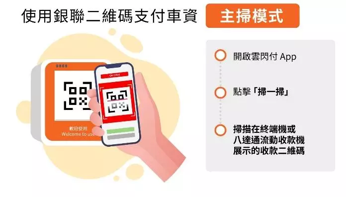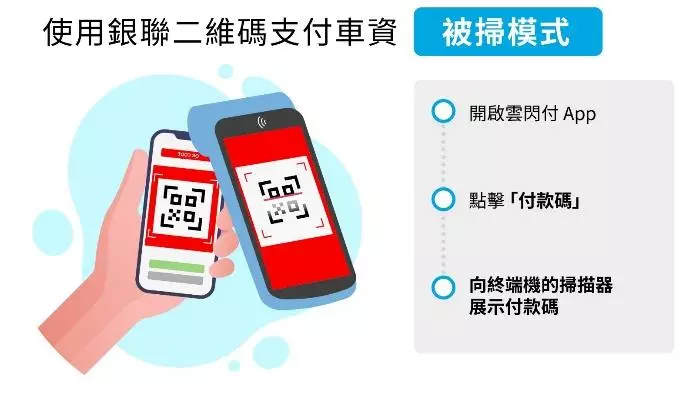 * 使用銀聯二維碼(以雲閃付App為例):上車前可留意車窗貼紙確認的士支援銀聯二維碼支付。支付時可選擇「主掃模式」,即開啟App內的「掃一掃」功能掃描司機的收款二維碼;或選擇「被掃模式」,即向司機的終端機展示App內的「付款碼」。
