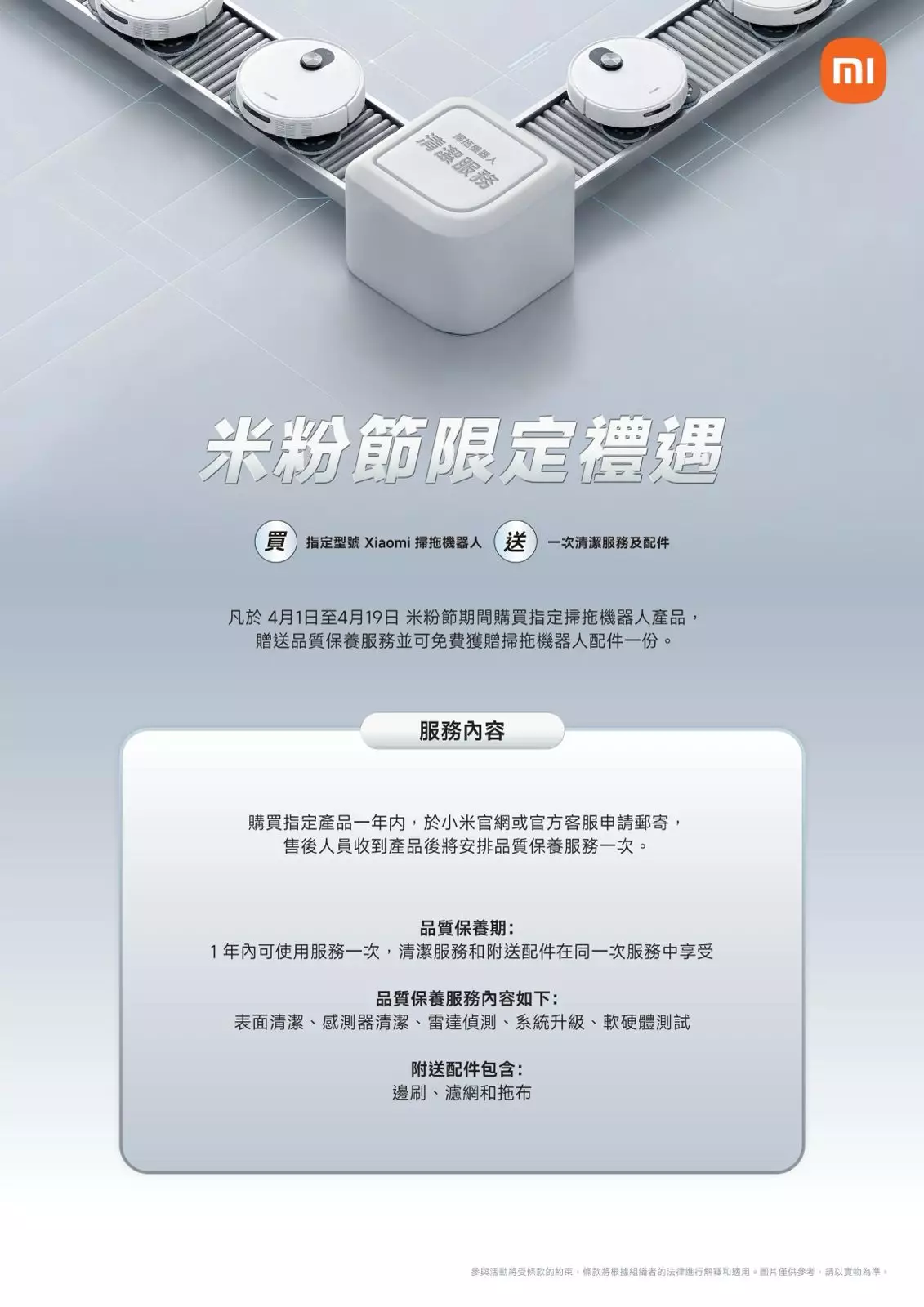 於全線小米之家門店購買指定掃拖機器人,可獲贈品質保養服務及配件