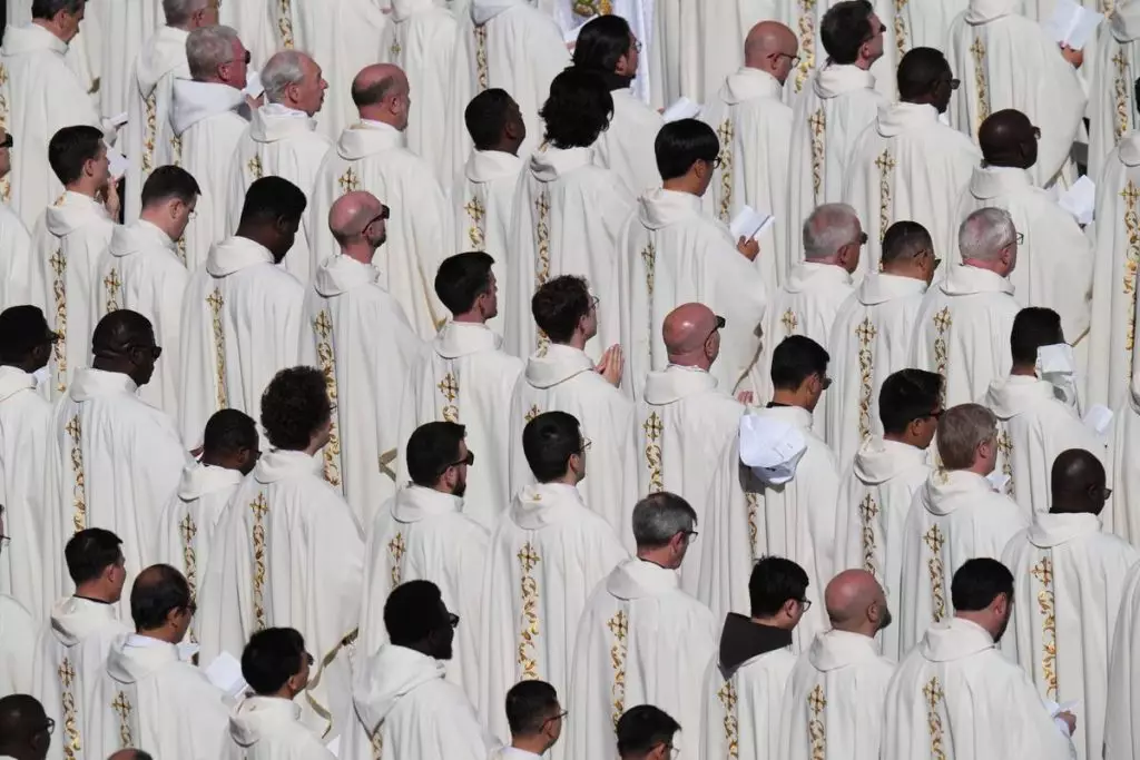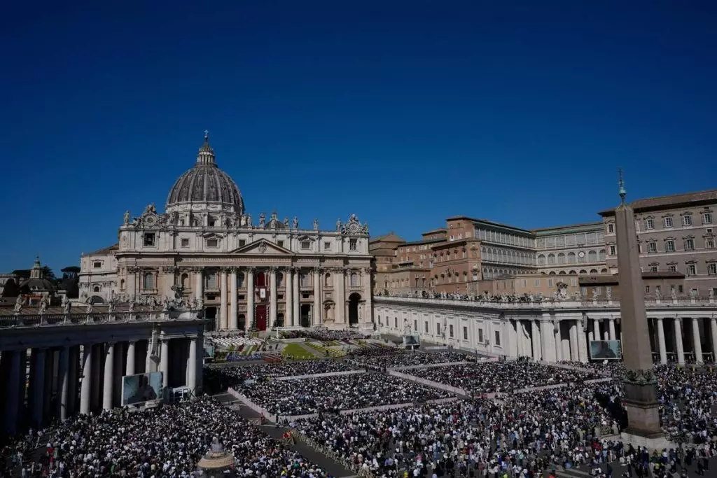 2026年4月5日周日,教宗良十四世在梵蒂岡聖伯多祿廣場主持復活節彌撒,神職人員隨行。(美聯社圖片/Alessandra Tarantino) AP圖片