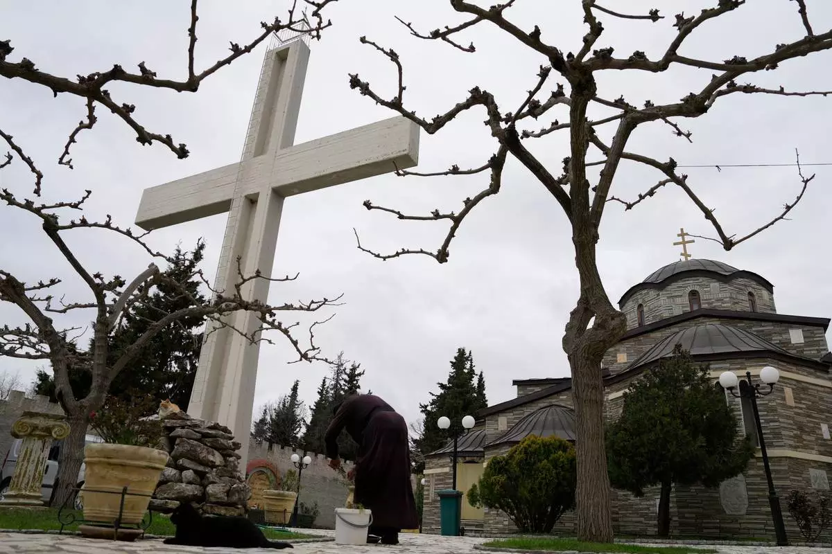 2026年3月20日周五,一名僧侶在雅典西北約236公里的特里科爾福村(Trikorfo)聖奧古斯丁與撒拉弗修道院(Monastery of St. Augustine and Seraphim)內照料植物。(美聯社圖片/塔納西斯·斯塔夫拉基斯) AP圖片