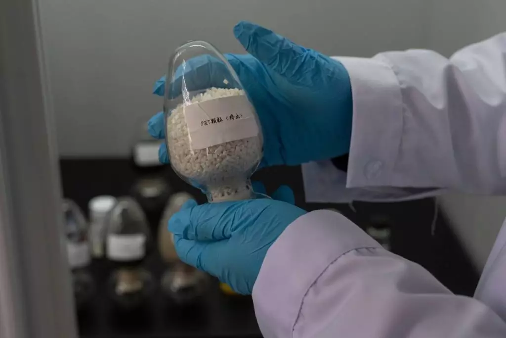 一名工人在中國東部江蘇省張家港一間紡織品分揀設施內,展示回收舊衣聚酯纖維的最終產品PET樣本。該設施採用弓葉科技(DataBeyond)的Fastsort-Textile(快速分類紡織)AI分揀機。攝於2026年3月20日。(美聯社圖片/Ng Han Guan) AP圖片