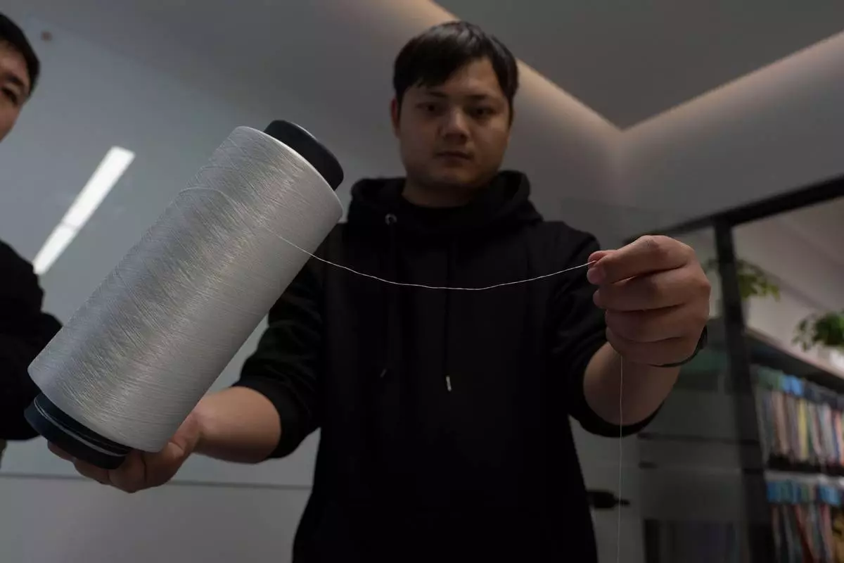 一名工人在中國東部江蘇省張家港一間紡織品分揀設施內,展示由回收合成紡織品製成的加工聚酯纖維紗線。該設施採用弓葉科技(DataBeyond)的Fastsort-Textile(快速分類紡織)AI分揀機。攝於2026年3月20日。(美聯社圖片/Ng Han Guan) AP圖片