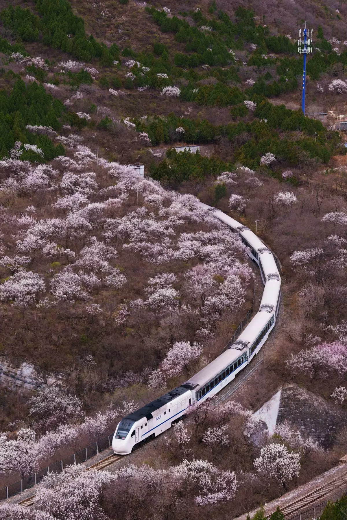 資料圖片:2026年3月30日,一列中國高鐵列車駛過北京郊外居庸關長城(Juyongguan Great Wall)旁的盛開桃花。(美聯社圖片/Vincent Thian) AP圖片