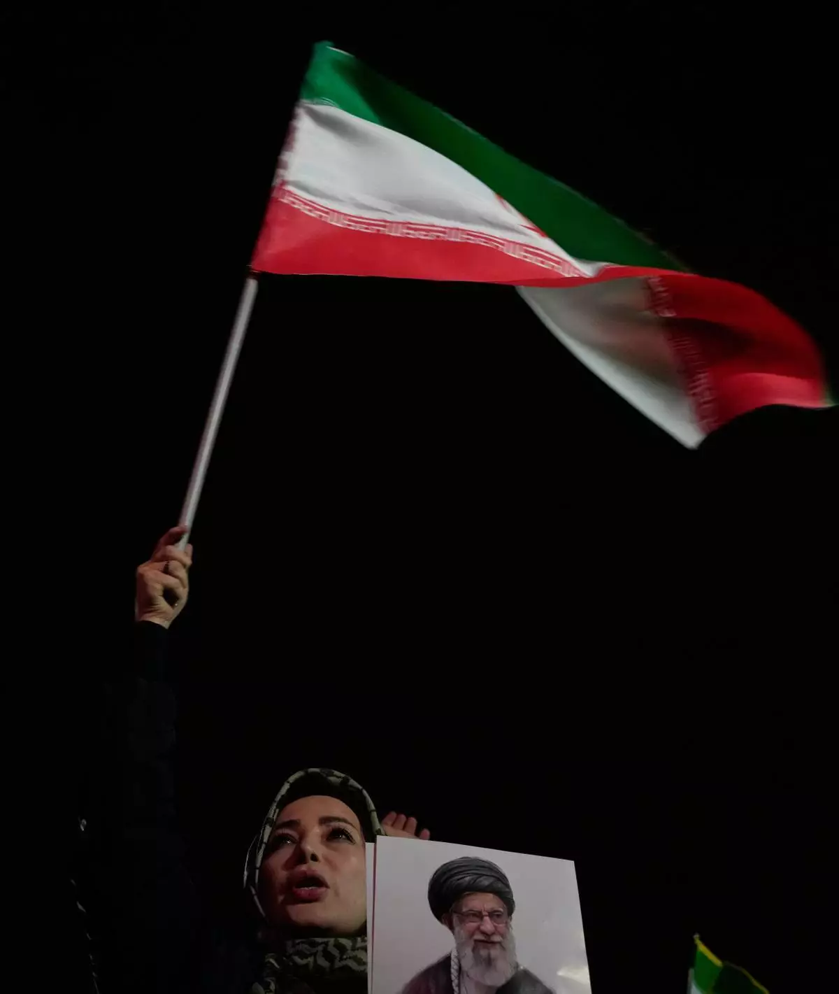 資料圖片:2026年3月25日,在伊朗德黑蘭(Tehran)西部一個廣場舉行的親政府集會上,一名女子揮舞伊朗國旗,手持已故伊朗最高領袖阿亞圖拉阿里哈梅內伊(Ayatollah Ali Khamenei)的肖像,並高呼口號。(美聯社圖片/Vahid Salemi) AP圖片