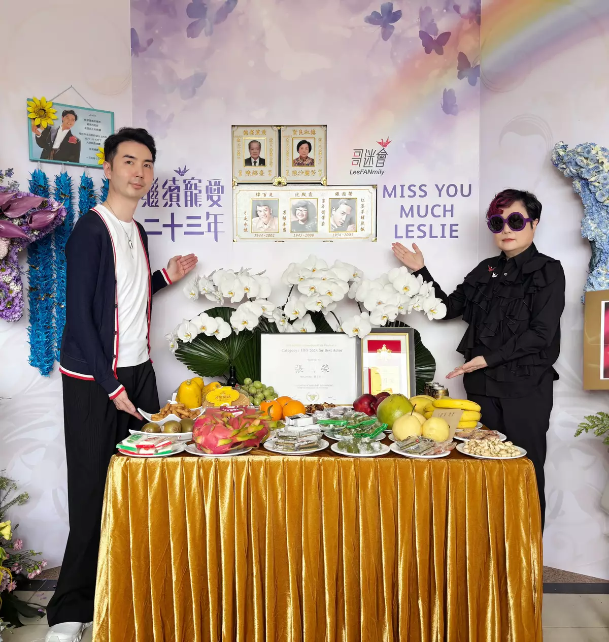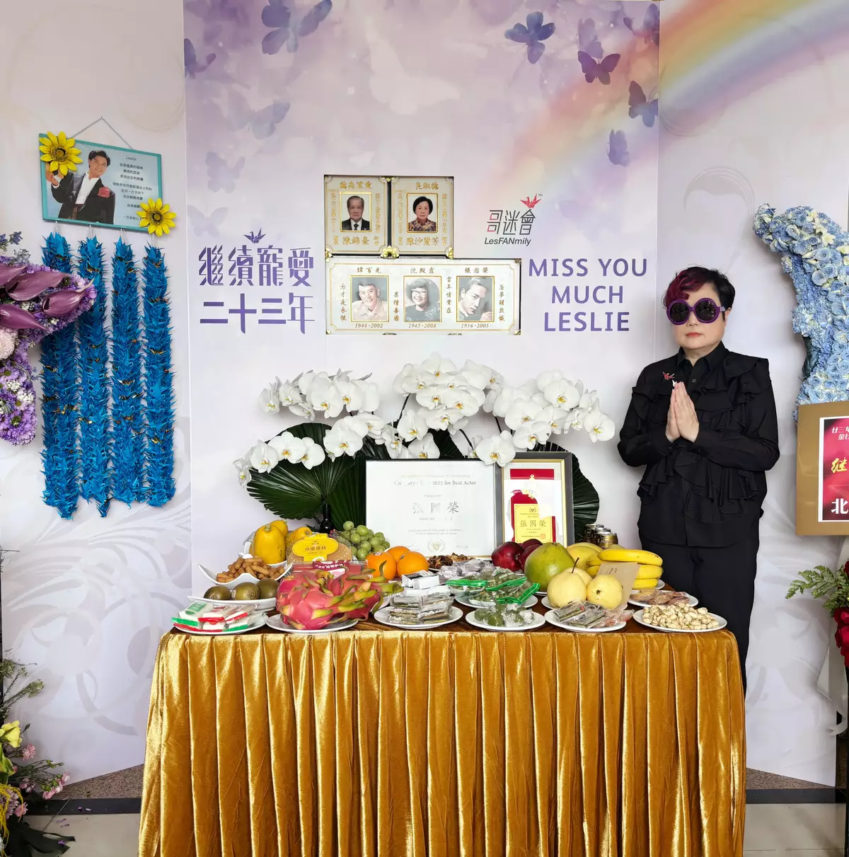 各地「哥」迷今年亦一如以往,紛紛送上他們的心意,令現場化為一片花海。長情的日本「哥」迷,一如以往每個紀念日,親手摺製千羽鶴帶來香港送給「哥哥」。韓國「哥」迷則把「哥哥」於2025年第一屆仁川國際民俗電影節,憑《霸王別姬》榮獲最佳男主角獎的獎牌,帶來獻予「哥哥」,並轉交由陳太代為保存。該屆仁川國際民俗電影節於去年6月在韓國仁川舉行,主辦單位當時特別邀請韓國「哥」迷代表上台代領獎項。