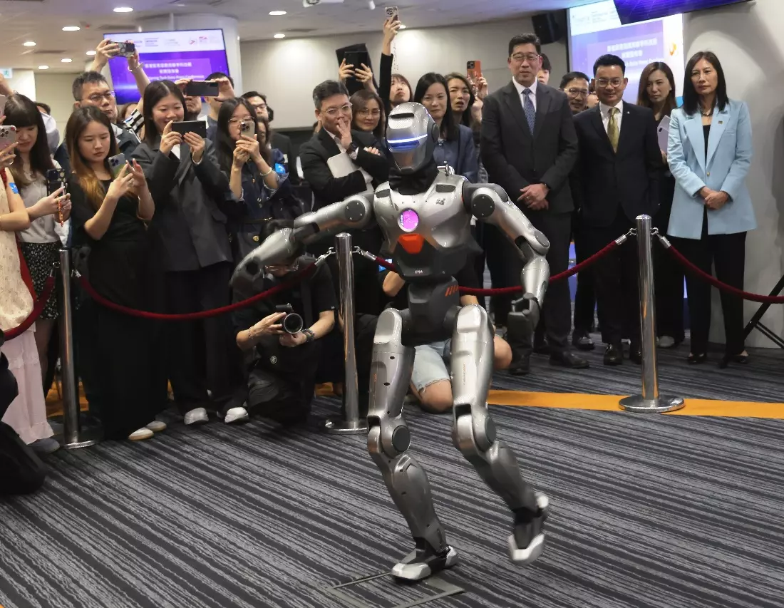 香港貿易發展局副總裁古靜敏介紹首度增設「RoboPark」機械人展區。圖為眾擎機器人科技的機械人,在現場跳舞,同型號機械人曾於全運會閉幕式表演。