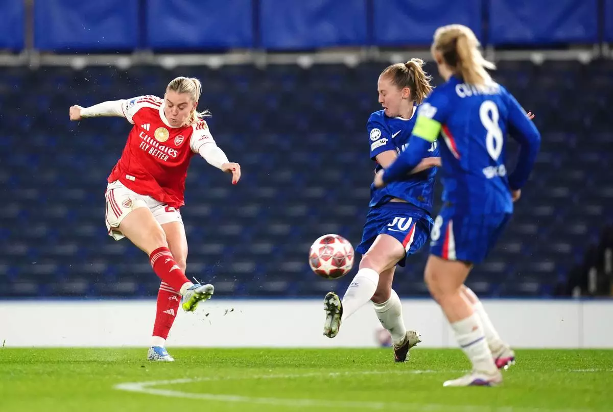 阿仙奴的布力斯甸紐斯(左)在2026年3月24日周二,倫敦舉行的女子歐聯足球賽中,阿仙奴對陣車路士期間,慶祝射入球隊首個入球。(美聯社圖片/John Walton) AP圖片