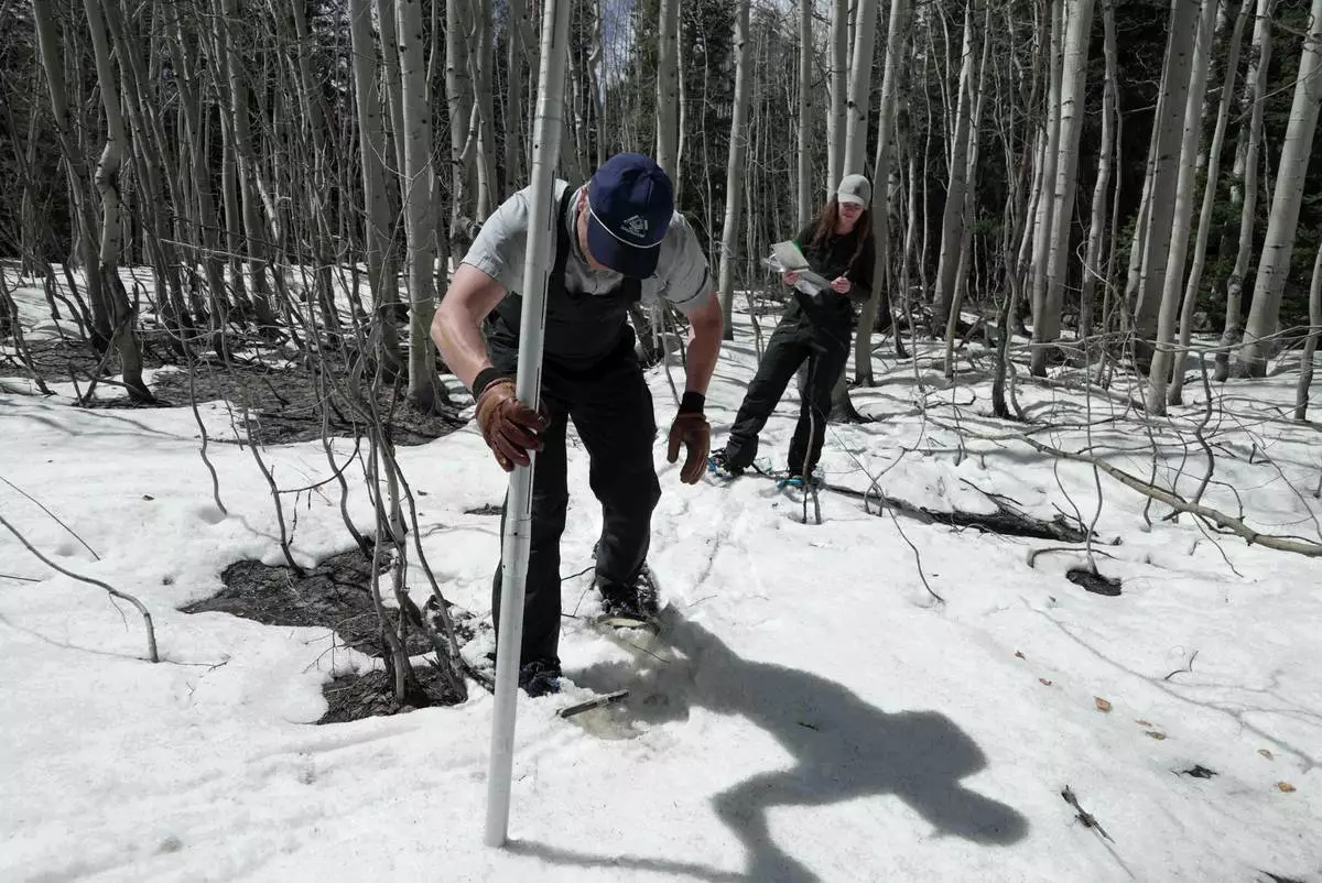 2026年3月30日周一,科羅拉多州克雷姆林(Kremmling, Colo.),克林頓·惠頓(Clinton Whitten)與水文學家莫林·古奇(Maureen Gutsch)(後)正在測量積雪。 (美聯社圖片/Brittany Peterson) AP圖片