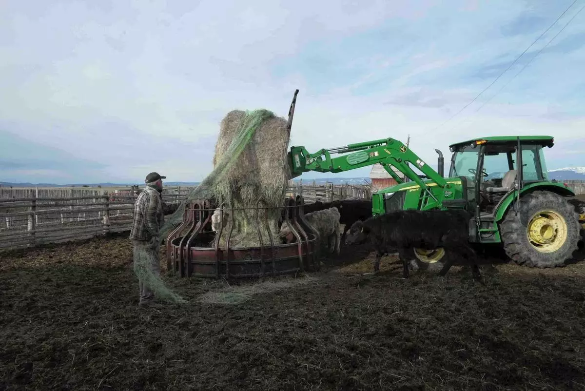 2026年3月31日周二,菲利普·安德森(Philip Anderson)在科羅拉多州沃爾登(Walden, Colo.)拉開一捆乾草上的塑膠。 (美聯社圖片/Brittany Peterson) AP圖片