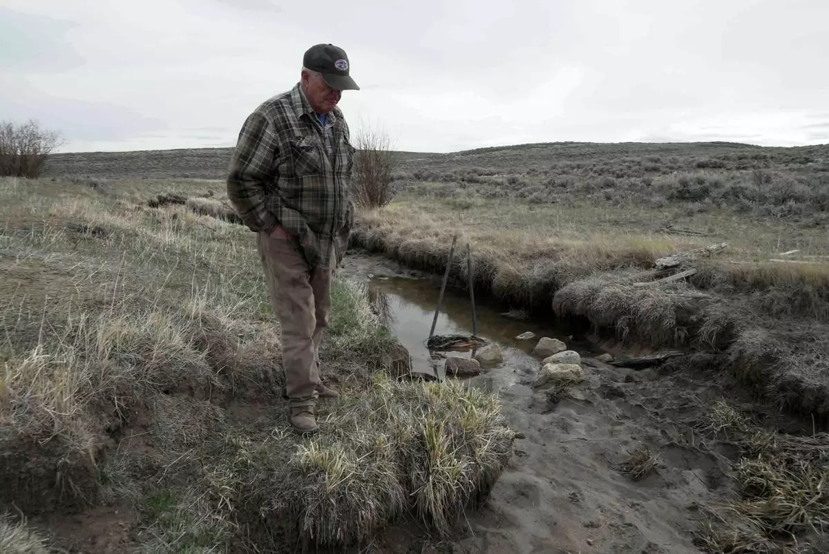 2026年3月31日周二,菲利普·安德森(Philip Anderson)在科羅拉多州沃爾登(Walden, Colo.)查看一條通常用於牲畜飲用及灌溉的乾涸溝渠。 (美聯社圖片/Brittany Peterson) AP圖片
