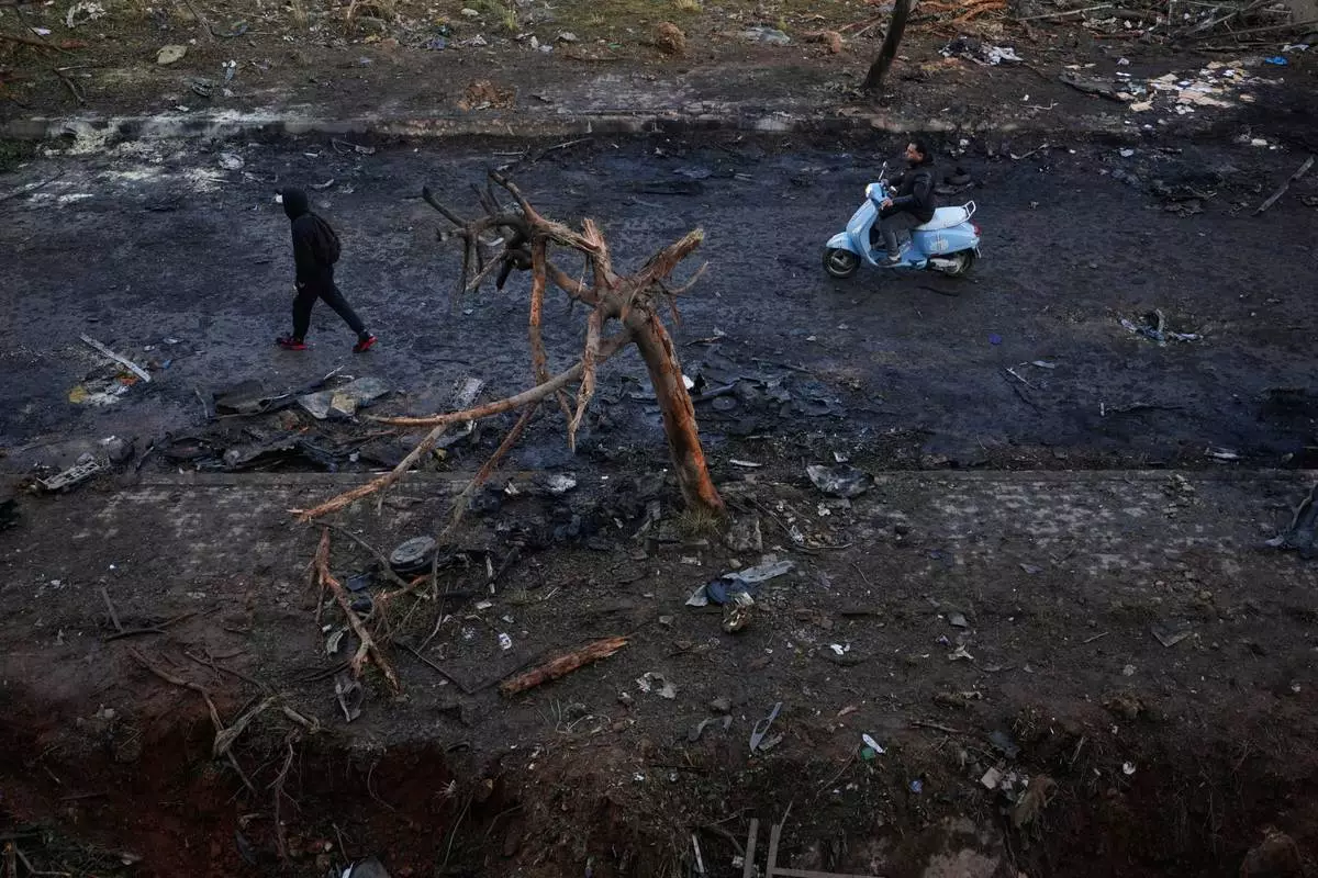 2026年4月1日周三,黎巴嫩貝魯特,一名男子騎電單車經過一棵燒焦的樹木和殘骸,此前當地曾遭受以色列空襲。(美聯社圖片/Hassan Ammar) AP圖片
