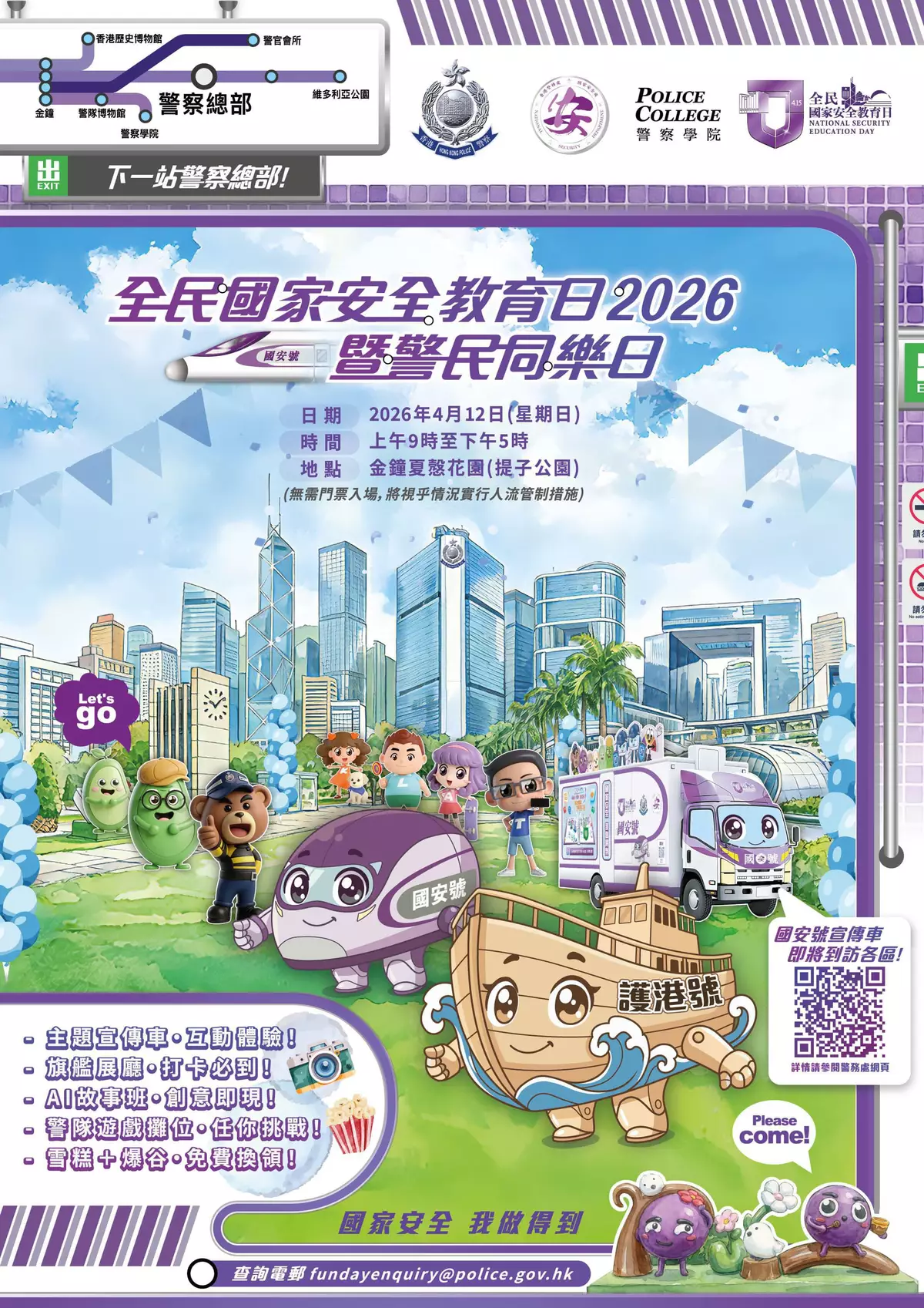 為響應「全民國家安全教育日」,警務處將於星期日 (4月12日)於金鐘夏慤花園(提子公園)舉辦「全民國家安全教育日2026暨警民同樂日」,讓市民加深對《「一國兩制」下香港維護國家安全的實踐》白皮書及總體國家安全觀的認識,同時更了解警務處在維護國家安全、公共秩序及安全的工作,並與市民同慶同樂!