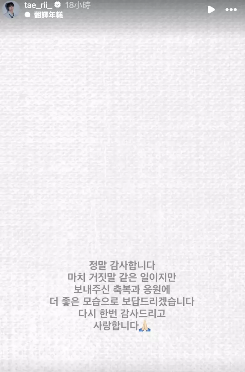 李泰利發文感謝大家對他的祝福。李泰利IG截圖