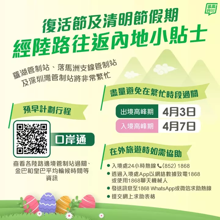 復活節及清明節長假期將至,政府預計在4月3日至7日期間,將有大約543萬人次經由各個陸路邊境管制站進出香港。當局呼籲計劃往返內地的市民應預早計劃行程,並盡量避開繁忙時間過關。