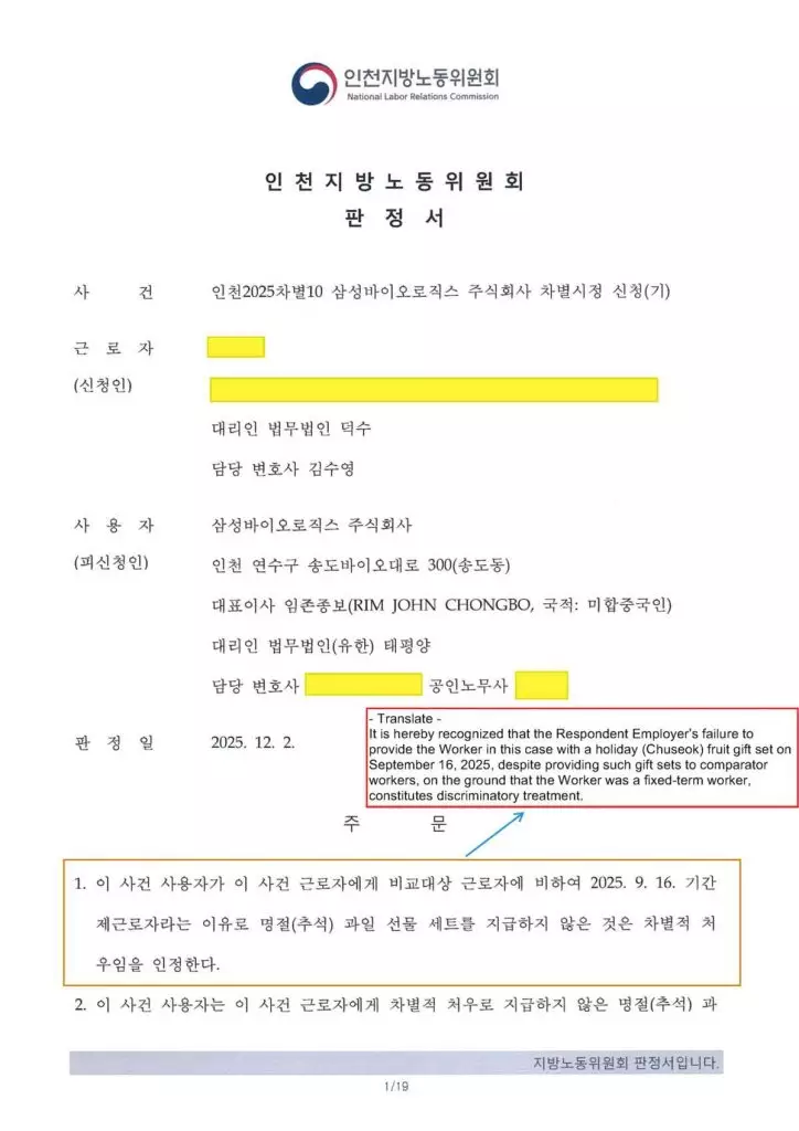 南韓仁川地方勞動委員會(Incheon Regional Labor Relations Commission)裁定,三星生物製劑(Samsung Biologics)將合約員工排除在節日禮品福利之外,構成歧視待遇。其後,三星生物製劑將法律顧問由Bae, Kim & Lee LLC律師事務所更換為韓國最大、最頂級的企業律師事務所Kim & Chang,並向國家勞動委員會(National Labor Relations Commission)申請覆核。