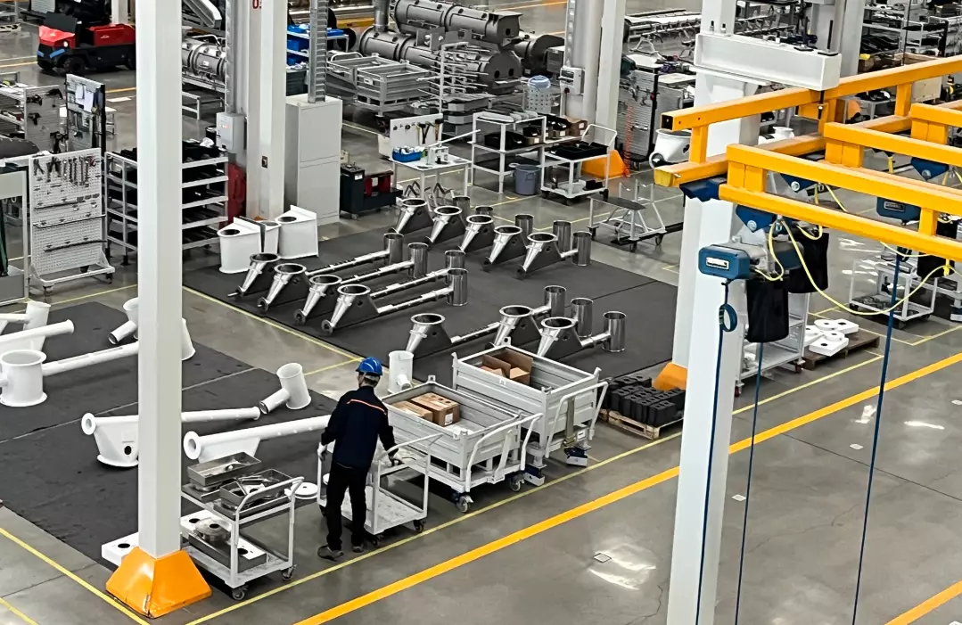豐尚智慧園生產車間內工人在各零件工作站之間操作,頭頂橫跨黃色柔性起吊系統。巴士的報記者攝