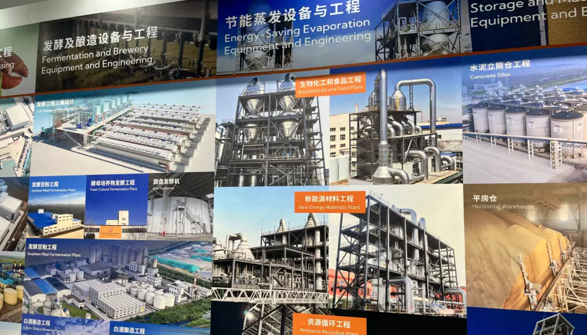 邁安德展廳展板展示旗下業務版圖,涵蓋發酵釀造、節能蒸發、固態發酵及資源循環等多個工程領域。巴士的報記者攝