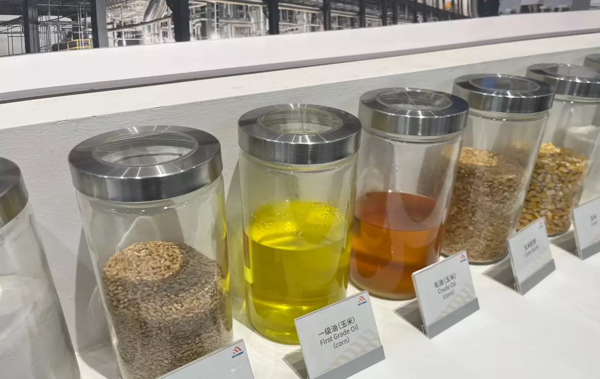 邁安德展廳展示由玉米毛油到精煉一級食用油的加工成品樣本,直觀呈現油脂深加工的工藝成果。巴士的報記者攝